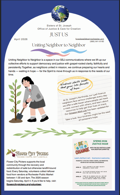 The Justice & Care for Creation Ministry of the Sisters of Saint Joseph of Rochester seeks to raise awareness and deepen understanding of issues of injustice toward our neighbor and our earth. Having learned and prayed, we move toward loving action, individually and in collaboration with others.